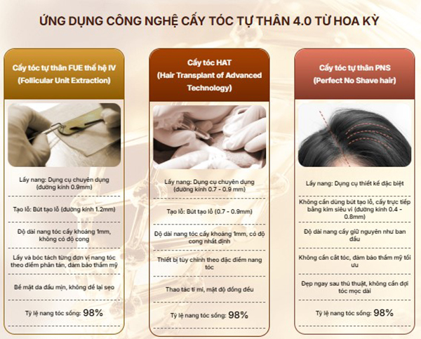 Bên cạnh công nghệ FUE mà mình được tư vấn thì phòng khám còn có phương pháp HAT, cấy tóc sợi dài PNS. Đây đều là những công nghệ hiện đại cấy tóc tự thân với hiệu quả cao.