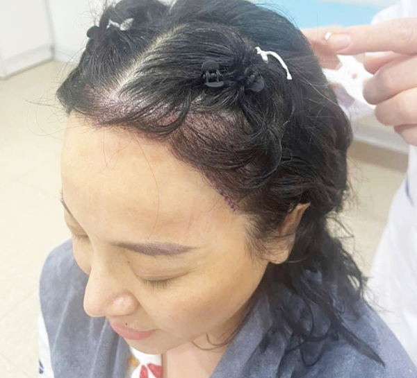 Qua thăm khám, bác sĩ nhận thấy chị Bích Nguyệt có đường chân tóc vùng trán cao, không đều. Mật độ tóc khu vực trán thưa hơn so với tổng thể mái tóc. Đây là tình trạng khá phổ biến ở nữ, đặc biệt là người có cấu trúc bẩm sinh trán cao, tóc mỏng theo thời gian.