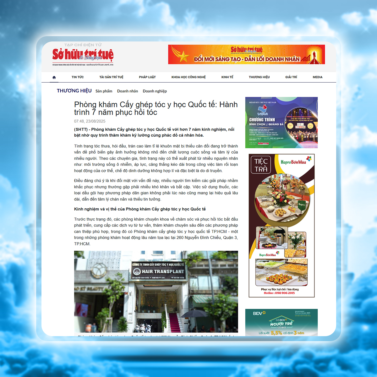 Cuối cùng, Tạp chí Sở hữu Trí tuệ đã có bài viết dài về hành trình 7 năm phát triển của Phòng khám Cấy ghép tóc Y học Quốc tế”. Bài viết cũng đã ghi nhận sự nỗ lực không ngừng để nâng cao chất lượng dịch vụ tại đây. Từ một đơn vị tiên phong, phòng khám đã trở thành biểu tượng trong lĩnh vực cấy ghép tự thân tại Việt Nam.