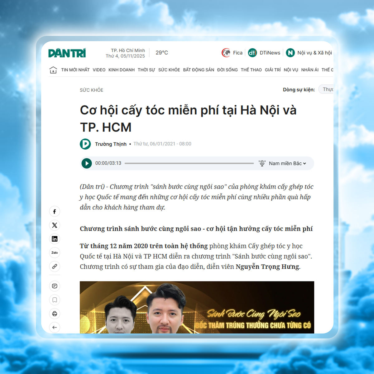 Trên báo Dân trí, Phòng khám Cấy ghép tóc Y học Quốc tế được nhắc đến như địa chỉ cấy tóc uy tín. Đồng thời phòng khám còn triển khai nhiều chính sách ưu đãi thiết thực cho khách hàng. Nhờ đó, nhiều người có cơ hội tiếp cận với công nghệ phục hồi tóc hiện đại mà không phải lo lắng về vấn đề chi phí.