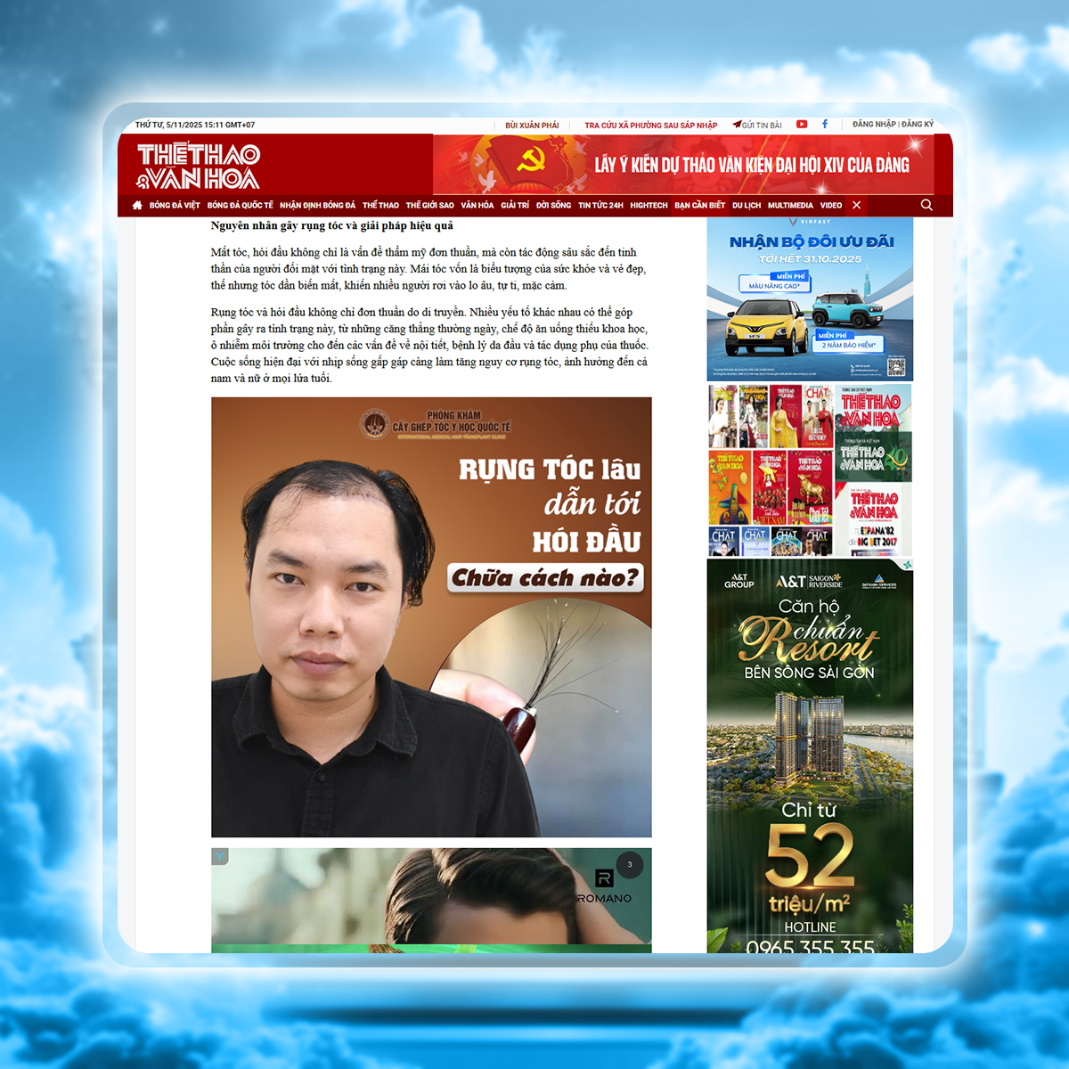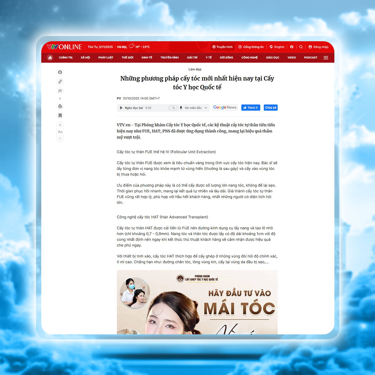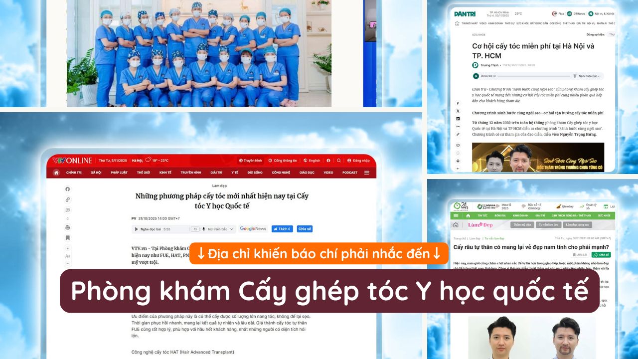 VTV, VnExpress, Dân trí, 24h, Phụ nữ… là những báo lớn đồng loạt đưa tin về Phòng khám Cấy ghép tóc Y học Quốc tế. Những bài viết này không chỉ phản ánh xu hướng phục hồi tóc hiện đại mà còn minh chứng rõ ràng cho uy tín và chất lượng thực tế mà phòng khám mang lại.
