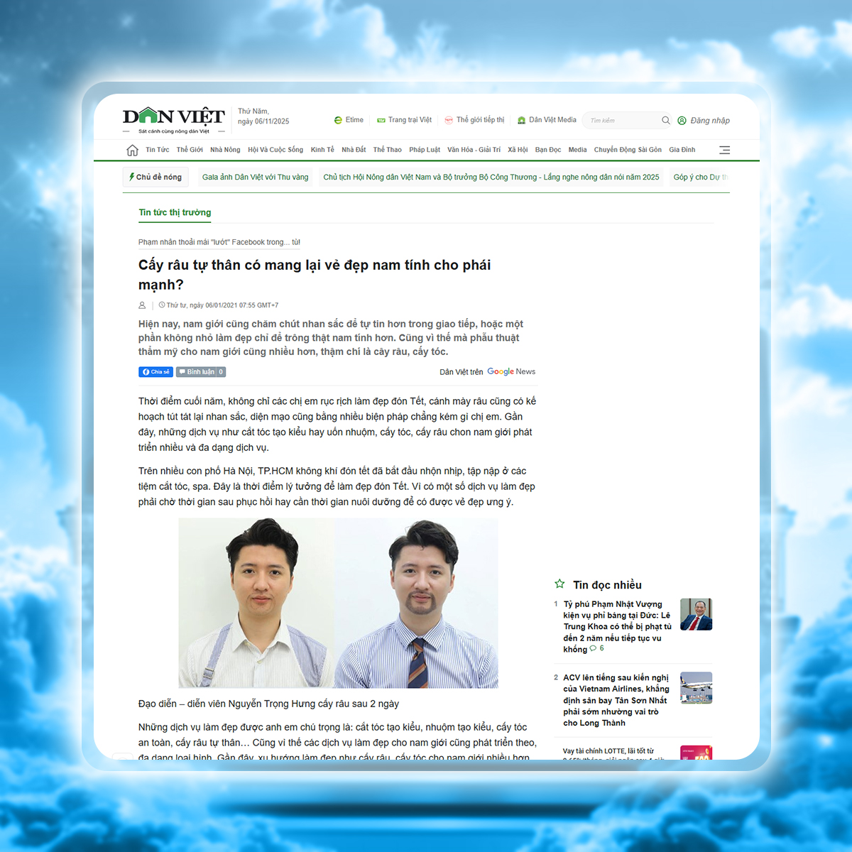Cấy ghép tóc Y học Quốc tế là địa chỉ tiên phong phát triển dịch vụ cấy râu tại Việt nam. Giúp nam giới sở hữu dáng râu ưng ý, phù hợp với khuôn mặt và phong cách riêng. Báo Dân Việt khẳng định, kỹ thuật này không chỉ tăng thẩm mỹ mà còn thể hiện bản lĩnh, nét đàn ông hiện đại.