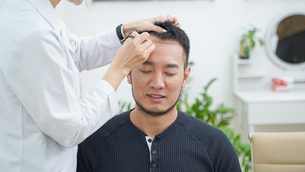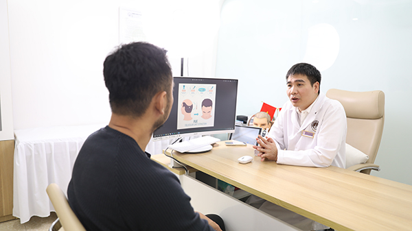 Trong buổi tái khám sau cấy, Bác sĩ Tuấn đánh giá tiến trình hồi phục của ca Hùng Lâm cấy tóc hói chữ M đang diễn ra đúng phác đồ chuyên môn: